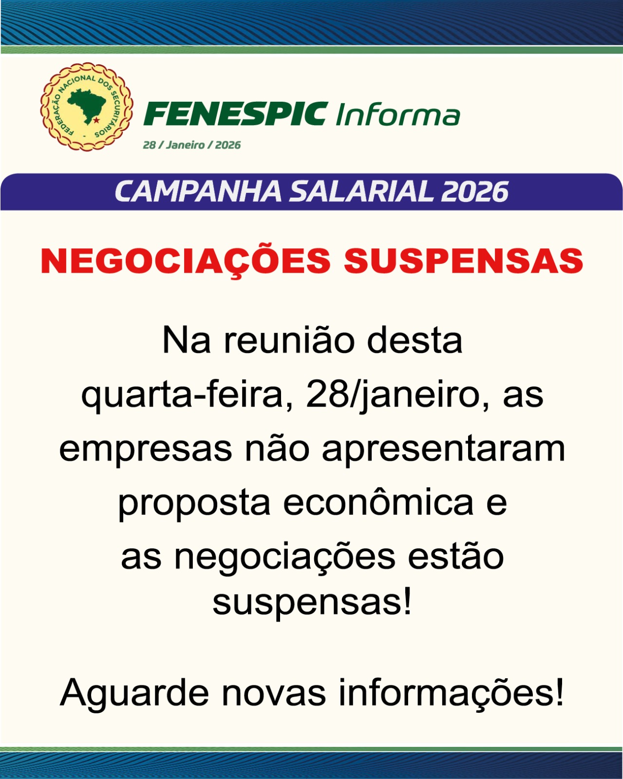 Diante desse cenário, e da ausência de elementos concretos para o debate, as negociações ficam suspensas até que o patronal apresente uma proposta que possibilite a continuidade das tratativas.